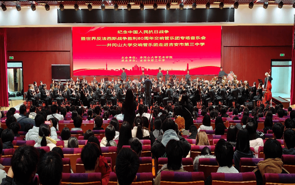 为纪念中国人民抗日战争暨世界反法西斯战争胜利80周年,2025年12月15日,一场融艺术感染、精神传承与协同育人于一体的音乐盛宴在吉安市第三中学隆重上演。由井冈山大学艺术学院主办、吉安市第三中学承办的专场音乐会,以交响管乐的艺术形式奏响红色旋律,生动实践了课程思政与艺术教育深度融合、美育资源协同共享的育人新路径。