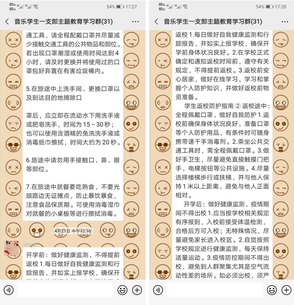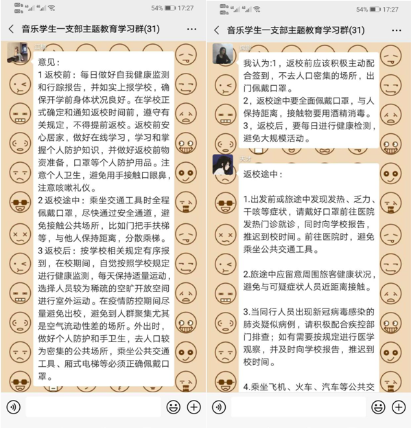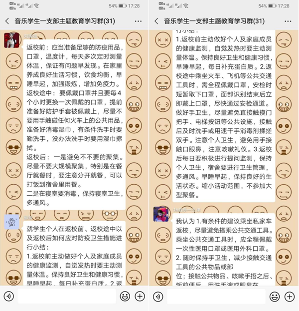 本次党员活动日主要就学生个人在返校前、返校途中以及返校后如何应对防疫卫生措施展开讨论,党员同志们都积极的发表了自己意见。活动中,纪翔同志强调:疫情防控工作是对“不忘初心、牢记使命”主题教育的深化,在这个特殊时期,广大党员同志一定要强化安全意识,充分发挥党员的先锋模范作用,为春季开学复课工作的有序开展,做好充足的知识储备和心态建设。