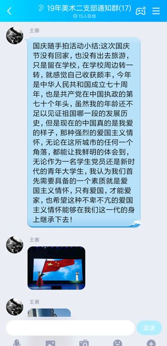 9月28日,在万书记的主持下,对每一位成员进行工作部署会,主题教育活动之“国庆随手拍”正式启动。国庆期间,支部的每一位成员都化整为零,在这普天同庆的日子里,拍下能够代表祖国70华诞的一景。10月7日晚,万书记组织大家在支部群发表自己的作品,以及此情此景的心得体会。大家踊跃发言,并表示要始终牢记党员使命,践行党员义务,坚定理想信念,用实际行动践行入党誓词。