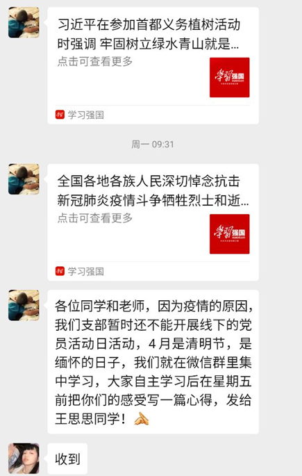 受疫情影响,支部决定开展线上党员活动日,线上线下同频共振,以高度的党性意识认真落实党组织的工作部署。会上,支部书记分享了习近平总书记在参加首都义务植树活动时重要讲话,和习近平等党和国家领导人在京出席哀悼活动。习近平总书记强调:这场新冠肺炎疫情防控斗争是中华民族伟大复兴历史征程中又一次前所未有的考验。在全国疫情防控形势持续向好、复工复产不断推进的时刻,我们一起参加义务植树,既是以实际行动促进经济社会发展和生产生活秩序加快恢复,又是倡导尊重自然、爱护自然的生态文明理念,促进人与自然和谐共生。与会人员认真聆听习近平总书记重要讲话内容,并每人提交一份学习心得,认真感悟习近平总书记重要讲话精神。