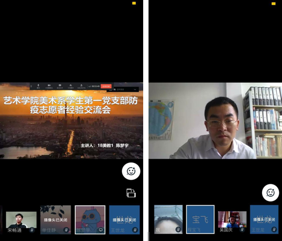 4月19日,为积极响应党中央关于开展以“防疫志愿者经验分享会”为主题活动号召,美术系学生第一党支部于网络教育平台开展以“防疫志愿者经验分享会”为主题的党员活动日的活动。参加活动的有支部书记胡亮同志、程宝飞同志,以及支部全体党员和入党积极分子。
