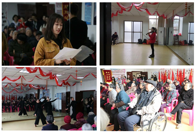 全体同学用歌曲、朗诵、器乐、舞蹈等表演形式全身心的展开表演。闪闪红星,照亮了一代代人前进的路,漫山遍野的映山红,映红了我们今天的生活,演出在歌曲《映山红》中拉开帷幕。演出的高潮部分是由小提琴独奏经典老歌《月亮代表我的心》,人有悲欢离合,月有阴晴圆缺,就像人生有好有坏,但依旧美丽的存在。最后以舞蹈《长亭外》结束本次演出。演出全程掌声不断,赢得了福利院全体人员的交相称赞。