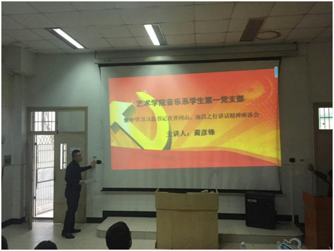 3月31日下午,艺术学院音乐系学生第一党支部在美术多媒体集中学习习近平总书记2016年春节前夕在江西考察时的重要讲话精神。会议由音乐系学生第一党支部书记蔺彦峰主持,党支部正式党员、预备党员、考察对象、入党积极分子共计98人参加此次学习。
