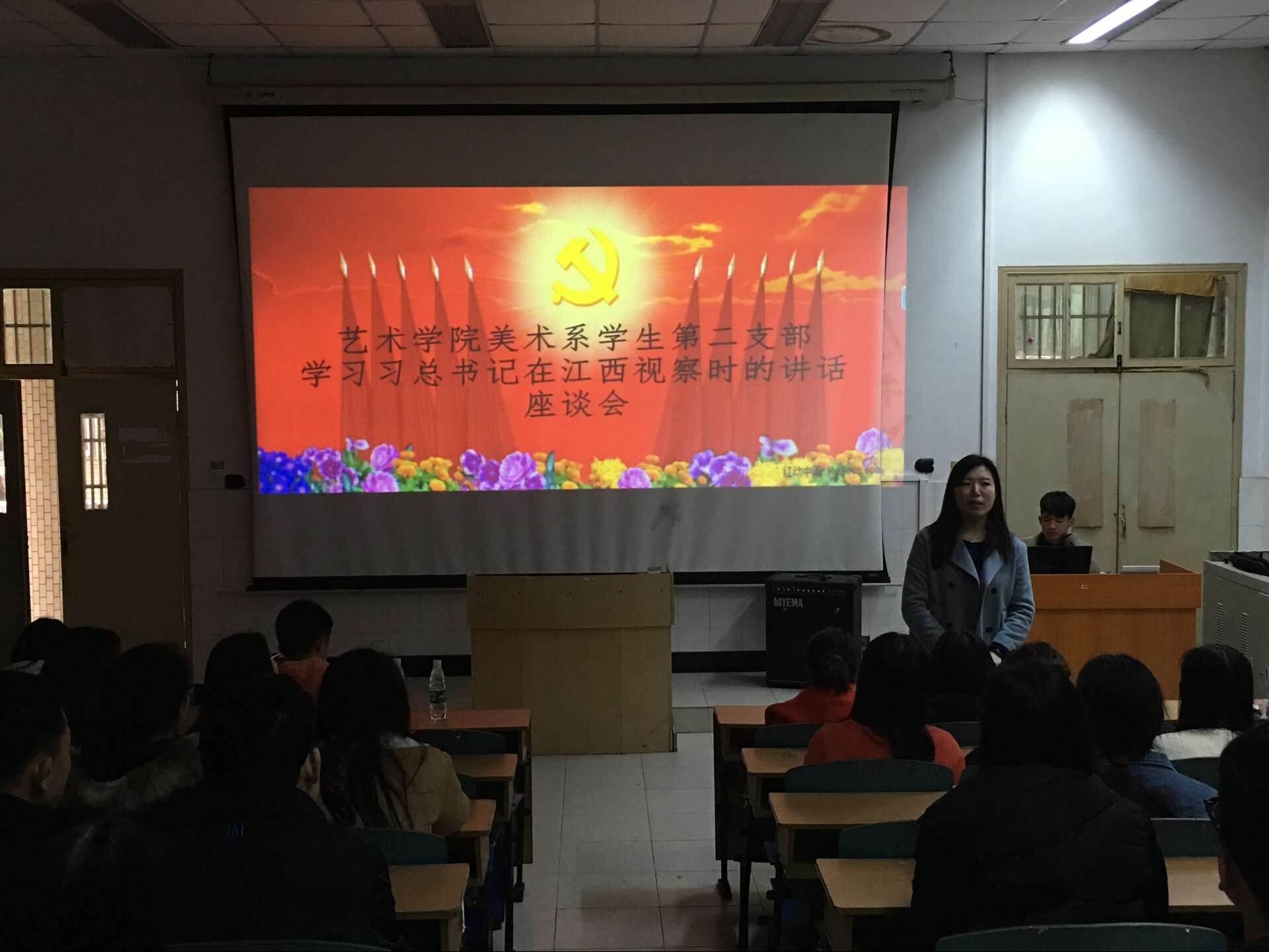 3月22日下午,艺术学院美术系学生第二党支部组织集中学习,重点学习习近平总书记2016年春节前夕在江西考察时的重要讲话精神。会议由美术系学生第二党支部书记邵璐主持,党支部正式党员、预备党员、考察对象、入党积极分子共计110人参加此次学习。