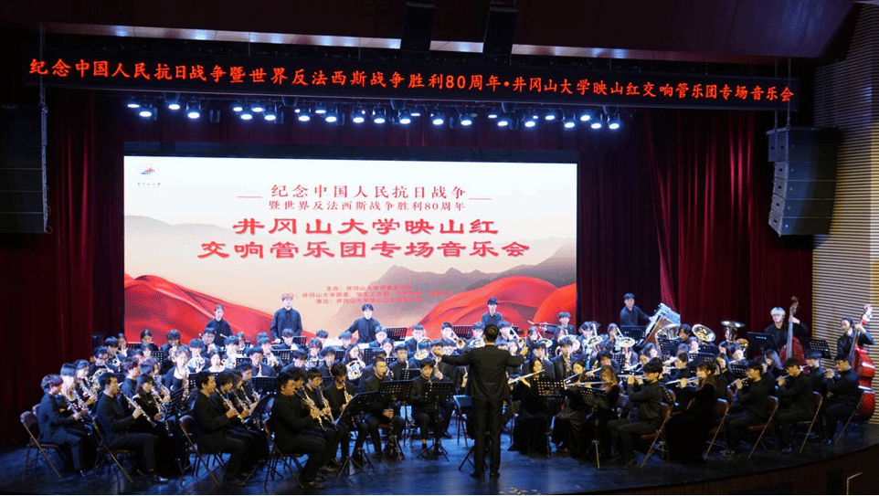 为纪念中国人民抗日战争暨世界反法西斯战争胜利八十周年,大力传承红色基因,凝聚时代奋进力量,11月22日,由井冈山大学党委宣传部主办,校团委、学生工作部、艺术学院、美育中心联合承办的“井冈山大学映山红交响管乐专场音乐会”在学校音乐厅奏响。延安大学党委副书记杨伟宏,临沂大学党委副书记崔晓红,河北师范大学党委常委、副校长邵军永,我校党委副书记肖宜安,党委常委、副校长敖四江,党委常委、宣传部长肖洪海出席;南昌大学、江西科技师范大学、南开大学、黑龙江八一农垦大学、东北石油大学、西藏民族大学等十余所高校的领导、专家学者,以及井冈山大学师生共计350余人共同欣赏了这场凝聚历史回响与时代精神的音乐盛宴。